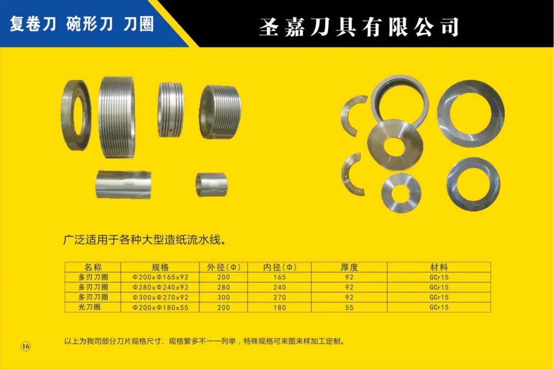 本公司所生產(chǎn)的各種型號(hào)規(guī)格分切、分條、分紙、復(fù)卷機(jī)圓刀片(蝶形上刀片、上刀架、下刀片、隔片、隔套、底棍、復(fù)卷刀、碗形刀、刀圈、大回旋圓切刀、砂輪、壓花輪、折疊刀、齒刀、異形刀)橫切刀、裁切刀、熱切刀、粉碎刀、切粒刀、撕碎刀、折頁刀、開槽刀、油墨刮刀、切臺(tái)圓刀、三孔刀、切管刀、氣壓刀組、剪切刀組、熱切刀組廣泛適用于造紙、紙制品加工、膠粘帶制品、薄膜、電線電纜、橡膠、輪胎、鋁箔、化纖、非織造布、復(fù)合包裝、卷煙、皮革、印刷、服飾輔料等行業(yè)。